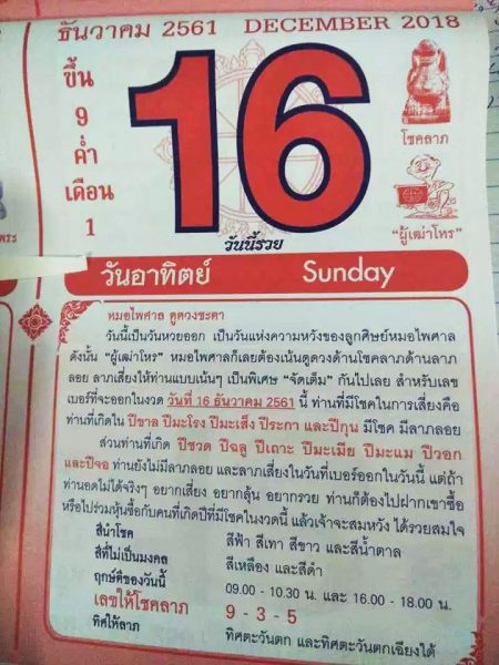 หวยปฏิทินหมอไพศาล 16/12/61 แนวทางเลขเด็ดงวดนี้