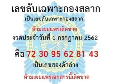 เลขลับเฉพาะกองสลาก 1/7/62 เลขสองตัวเด่น